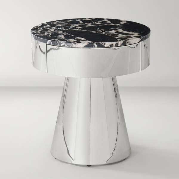 The Flare End Table in White brings an air of refinement to your home. Its crescent-shaped natural white marble top rests on a gleaming gold-plated stainless steel base, creating a balance of beauty and functionality. The soft-close drawer ensures convenient storage while maintaining its clean, timeless look.ZG ExclusiveDETAILS AND DIMENSIONSThe natural tones and veining give the rich marble top a strikingly sophisticated look.Base with anti finger print finish (Easy to remove finger prints)Storage drawer with concealed finger pull.Looks great to match with accent chair, or use as nightstandWhite marble top, plated stainless steel baseSoft close drawerMarble with dramatic veining, so each piece is one of a kindColour: WhiteSold separatelyFrame Material: Stainless steelDia 20" x 21"HImportedOTHER INFOFor indoor use onlyMarble is porous and can stain, particularly with dark liquids. Wipe spills immediately.Keep dryTo prevent oxygenization, please don't place this product in high moisture space or wet floorEasy assembly within 30 minutes