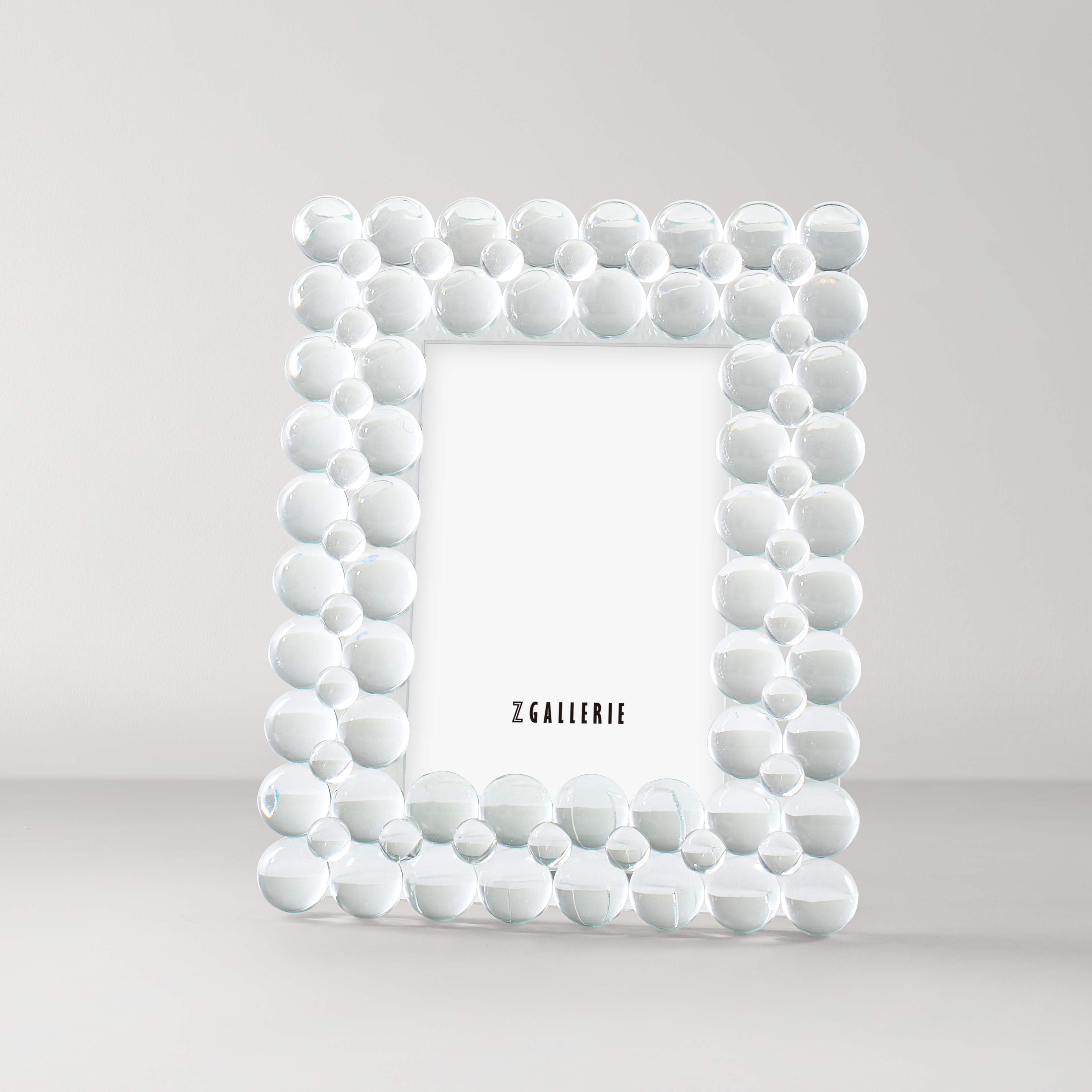 Elevate your cherished memories with the Hanna Frame. Its distinctive bubble detailing adds a playful touch of luxury, while the clear glass design lets your photo shine. More than a frame, it’s a decorative statement piece that enhances any space.DETAILS AND DIMENSIONSCrystal GlassSmall: 8"W x 10"H, holds a 4" x 6" photoLarge: 9.25"W x 11.6"H, holds a 5" x 7" photo.Sold separatelyImported